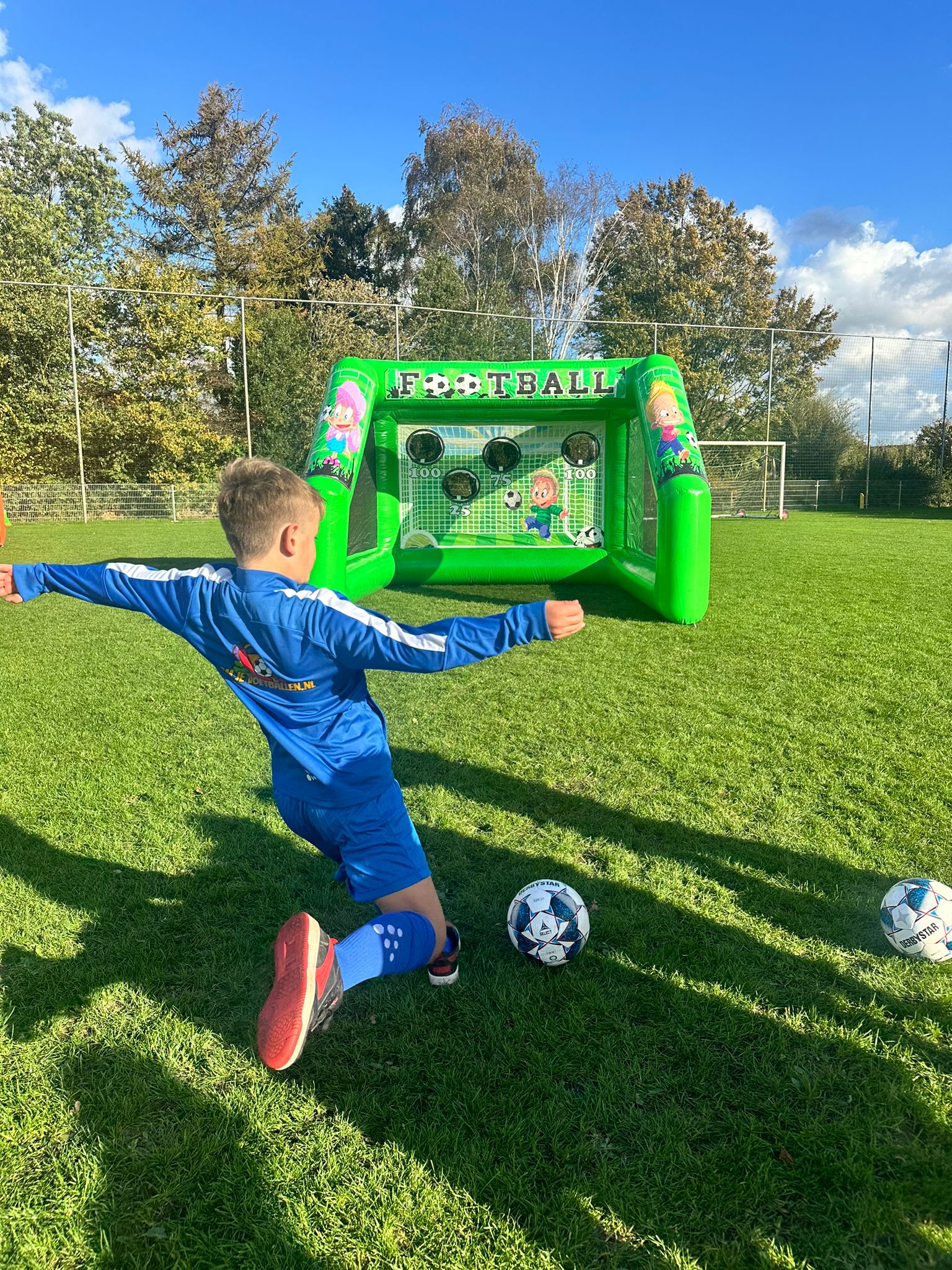 De kleinere voetbal goaltje is super leuk om in te zetten voor bijvoorbeeld een sportdag! Het goaltje is verkrijgbaar in de kleur groen. In het doel is een zeil geplaatst waar een mooie voetbal animatie op is geprint. In het zeil zitten verschillende gaten met elk zijn eigen punten. Erg handig als er geen keeper in de buurt is en jij jou doelschoten wilt oefenen! Omdat het zeil uitneembaar is, kan de goal ook worden ingezet als een gewoon doeltje. De goal heeft dezelfde afmetingen als een zaalvoetbaldoel. De voetbal goal is een leuk en uitdagend voetbal spel voor jong en oud!