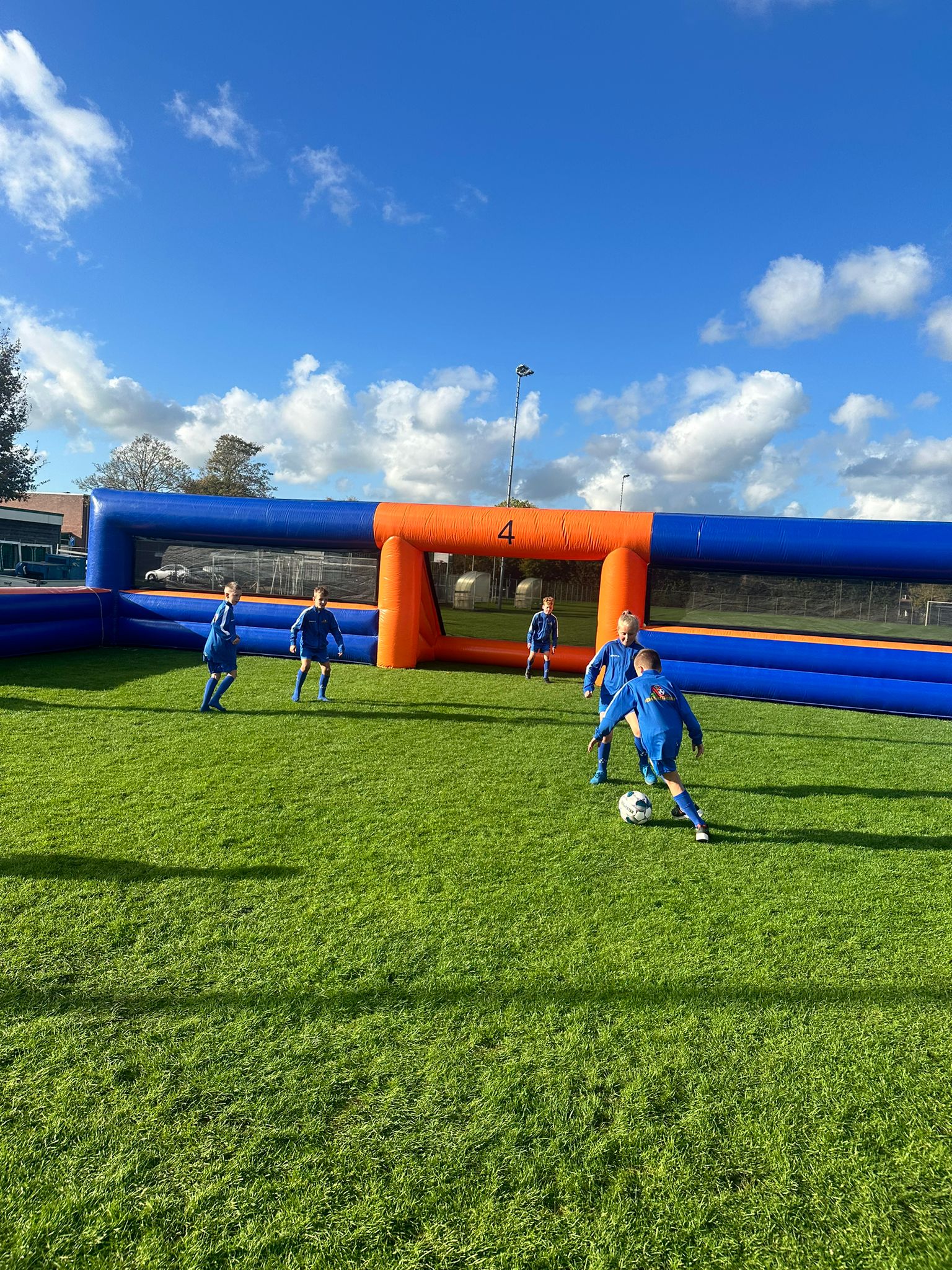 Deze opblaasbare springkussen is te huur, bij Komjevoetballen.nl
